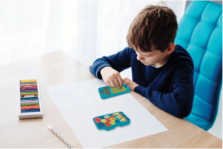 Veselý design v modro‑žlutém provedení motivuje děti k učení a zpříjemňuje práci s čísly. Kalkulačka je napájena běžně dostupnou baterií LR54, která je součástí balení – není tedy nutné nic dokupovat.