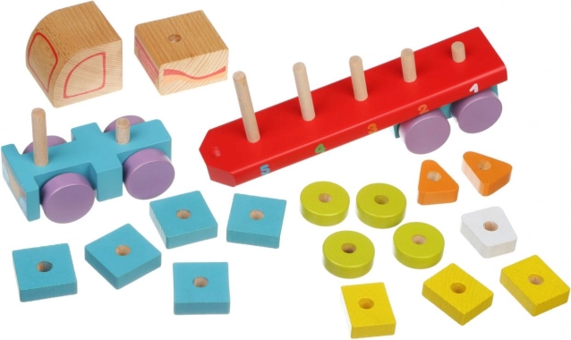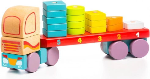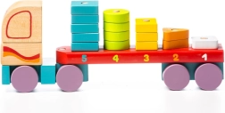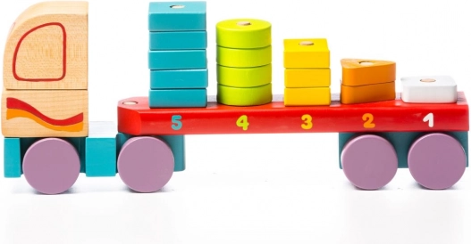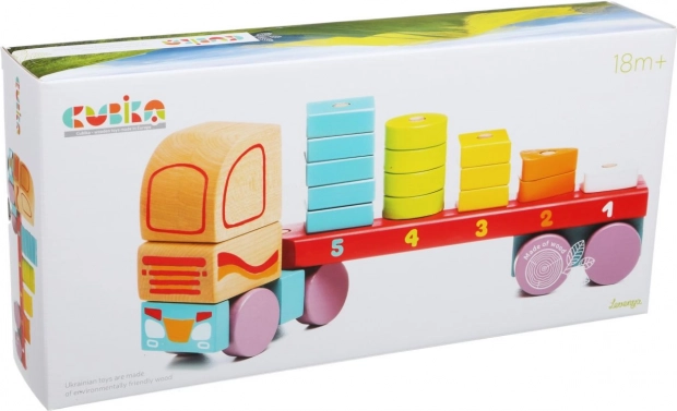 Dřevěná skládačka CUBIKA Kamion s geometrickými tvary je více než jen hračka. S 19 barevnými díly lze děti učit přiřazovat tvary a barvy, což rozvíjí jejich senzomotorické schopnosti. Každá součást je navržena tak, aby zapadala do dalších, a pokročilejší stavitelé mohou kontrolovat správnost počtu vyskládaných dílů podle číslic na podvozku kamionu.