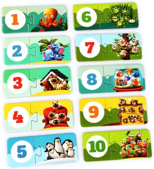 Zábavná naučná sada pro nejmenší: 20 pevných dílků tvoří 10 dvojic, které děti spojují podle počtu zvířátek a číslic 1–10. Hra podporuje logické myšlení, jemnou motoriku a poznávání čísel, je vyrobena z odolného vícevrstvého kartonu a snadno se udržuje otřením vlhkým hadříkem.