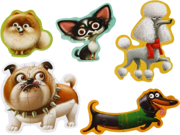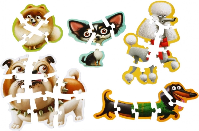 Tato sada dětských puzzlí Puzzlika přináší 5 roztomilých obrázků pejsků, které si děti složí z různě náročných dílků (4–8 na obrázek). Díky velkým a pevným dílkům se puzzle výborně drží v malých ručičkách a podporují soustředění i trpělivost.