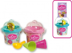Rozkošná dětská sada na písek ve stylu zmrzliny potěší každého malého stavitele. Obsahuje kyblík s víkem ve tvaru poháru, kopečkovač a 2 kornoutky. Vyrobeno v Itálii z kvalitního plastu, ideální pro děti od 12 měsíců. Lehká, kompaktní a skvělá na pískoviště i pláž.