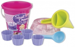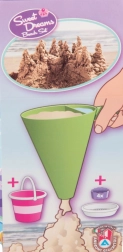 Kyblík, průhledné sítko ve tvaru dortu, lopatka, 4 tvořítka ve tvaru bábovky, dekoratérský trychtýř