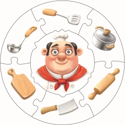 Ilustrace kuchaře s náčiním (vařečka, hrnec, váleček) napomáhá rozvoji logiky a poznávání každodenních činností.