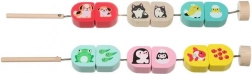 Navlékání dřevěných dílků se snáze drží díky kolíčku na šňůrce. Děti procvičují úchop, přesnost a trpělivost při skládání zvířecích dvojic.