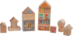 Sestavte vlastní malebné městečko z pečlivě zpracovaných dřevěných kostek a vydejte se na výlet s dvěma malými autíčky. Díly různých tvarů – kvádry, trojúhelníky, válce i můstky – se skvěle kombinují a motivují děti ke kreativnímu stavění i k volné hře.