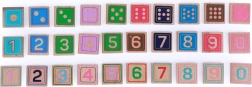 Číslice 0–9, matematická znaménka, tečky jako na kostkách i tematické kartičky s obrázky podporují učení formou hry.