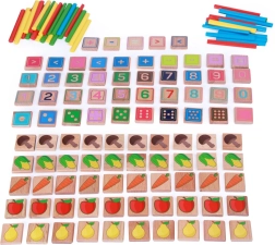 Součástí balení jsou dřevěné kartičky s čísly, tečkami jako na kostkách, obrázky ovoce a zeleniny, dále matematická znaménka a barevné počítací tyčinky o délce 8 cm. Dílky jsou příjemné na dotek a odolné pro každodenní hraní.