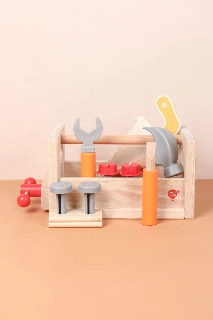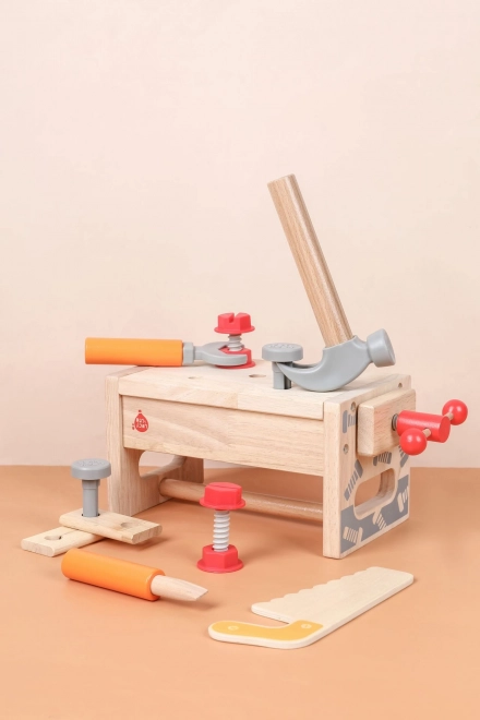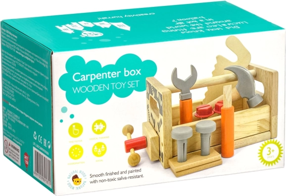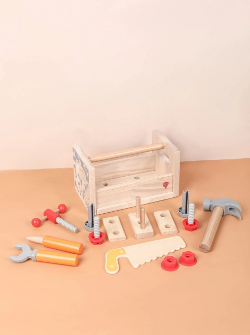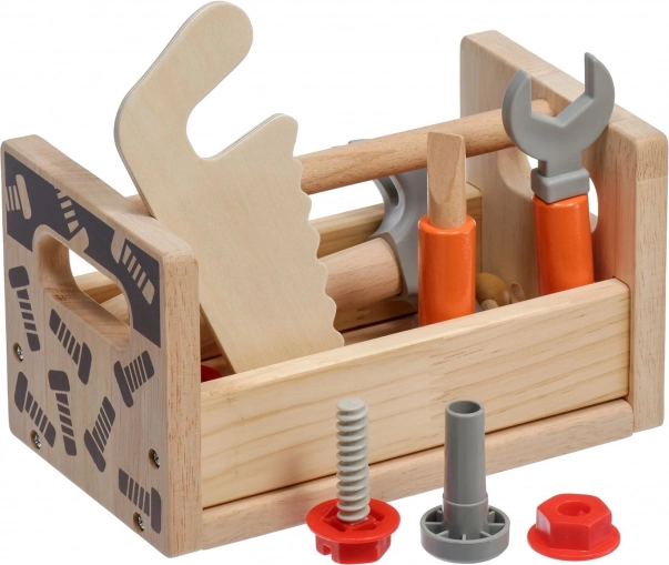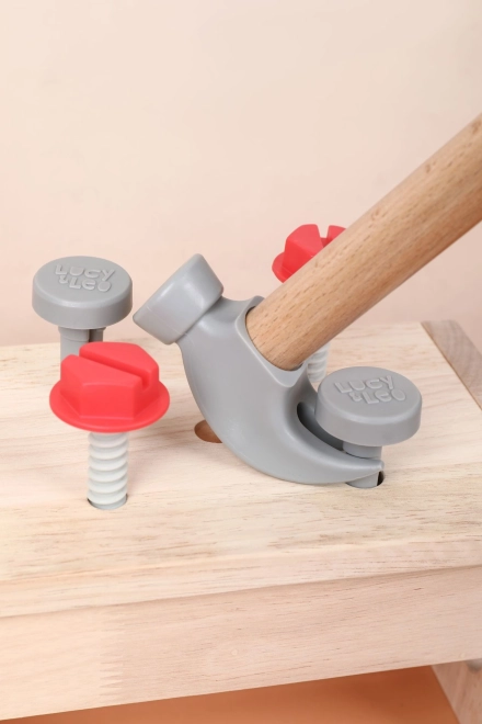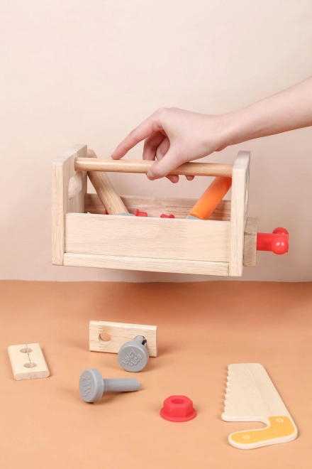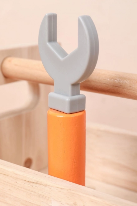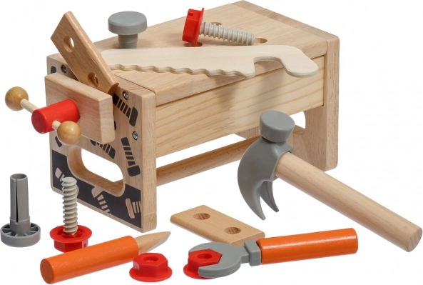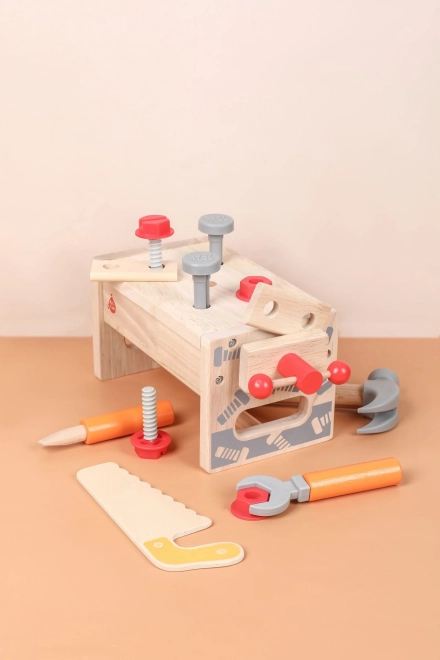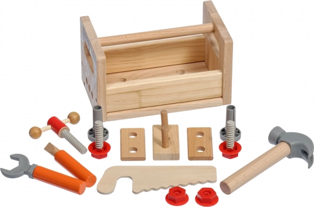 Součástí setu je rozmanité dětské nářadí: kladivo, pilka, šroubovák, klíč, šrouby a matky, svěrák a hladké dřevěné dílky s otvory. Vše má své místo, takže se děti učí pořádek i základní techniky práce se spojovacím materiálem. Hra podporuje kreativní stavební hry, koordinaci oko–ruka a trpělivost.