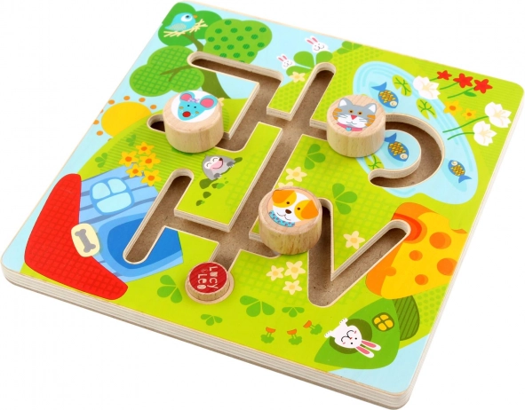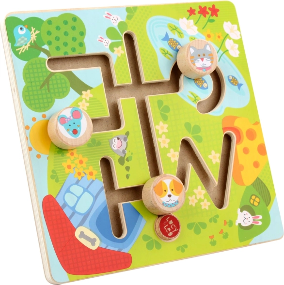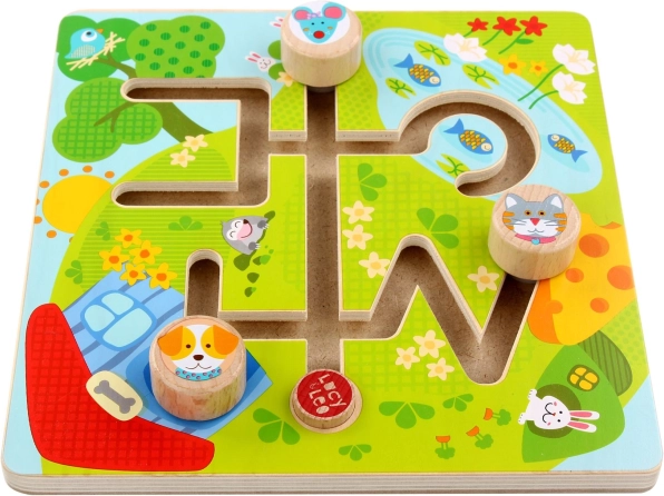 Dřevěný labyrint Slunné údolí přináší dětem radost z objevování i učení. Ilustrovaná hrací deska s rybníkem a zelení vtáhne děti do hry, kde pes, kočka a myška putují ke svým cílům. Díky plynulým drážkám se figurky snadno posouvají a hra je tak bezpečná a intuitivní.