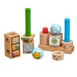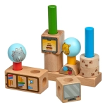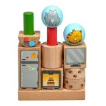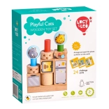 Odolné dřevěné tvary s jemně broušeným povrchem a ilustrovanými motivy kočiček a předmětů. Ideální pro malé dětské ruce.