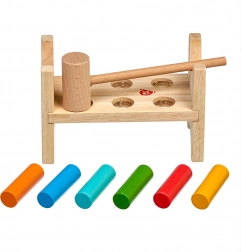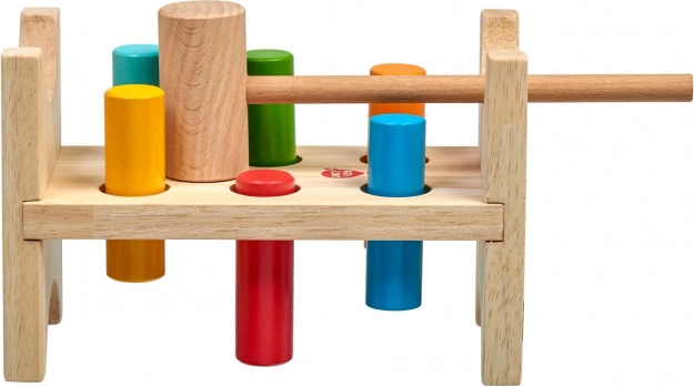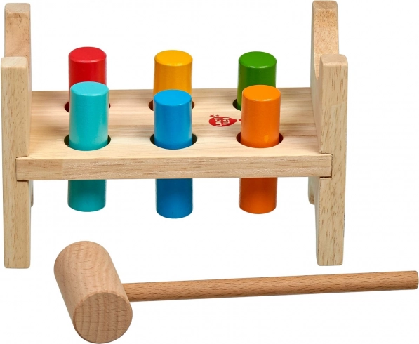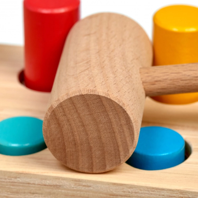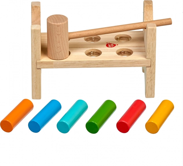 Šest barevných kolíků a dřevěné kladívko učí děti přesnému úchopu, síle úderu a koordinaci oko–ruka.