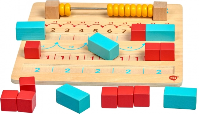 Dřevěná vzdělávací sada pro první krůčky v matematice od LUCY & LEO rozvíjí logiku, počítání a jemnou motoriku formou hry. Obsahuje hladkou dřevěnou desku s počítadlem a drážkami pro kostky, 10 červených kostiček a 5 modrých kvádrů pro základy sčítání a odčítání. Bezpečné provedení a odolné materiály jsou ideální pro děti od 3 let.