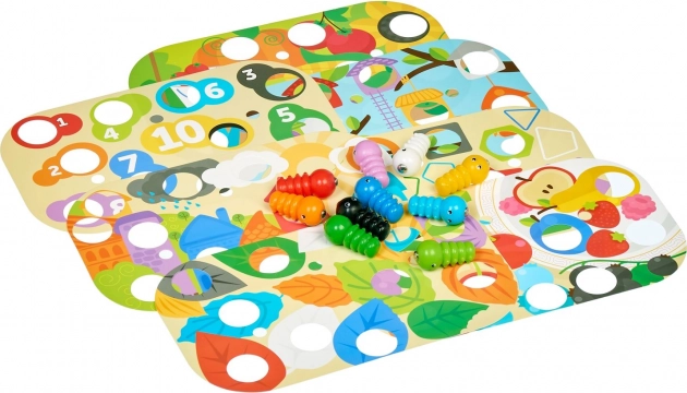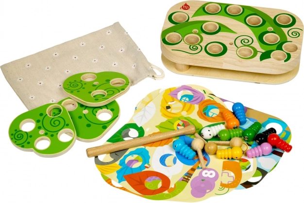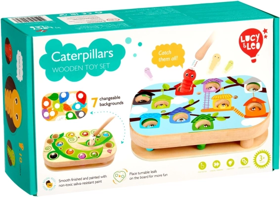 Zábavná a vzdělávací hra Lucy & Leo chytání housenek rozvíjí jemnou motoriku, logické myšlení a koordinaci oko–ruka. Pomocí magnetické hůlky děti chytají barevné housenky do otvorů v dřevěné desce a zkouší různé úrovně obtížnosti s vyměnitelnými předlohami a otáčivými listy.