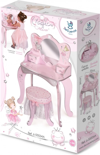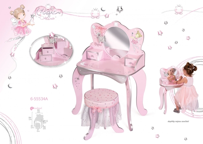 Tento dřevěný toaletní stolek je inspirován pohádkou a je ideálním doplňkem do každého dívčího pokojíčku. Je dekorován krásnými potisky a obsahuje