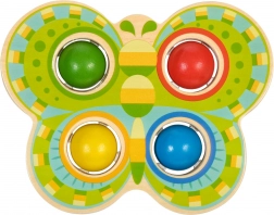 Barevný motýl s otvory pro čtyři koule (zelená, červená, žlutá, modrá) pomáhá s rozpoznáváním barev a udržuje pozornost.