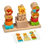 Set obsahuje pevnou dřevěnou základnu, rozmanité kostky různých velikostí a 14 oboustranných karet s výzvami. Na zvířátkových kostkách jsou motivy ve verzi „den“ a „noc“, což přidává hře příběhový rozměr. Po hraní vše snadno uložíte do lněného sáčku.