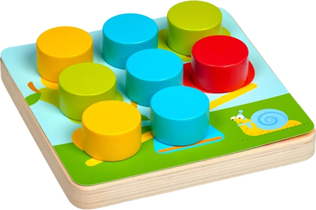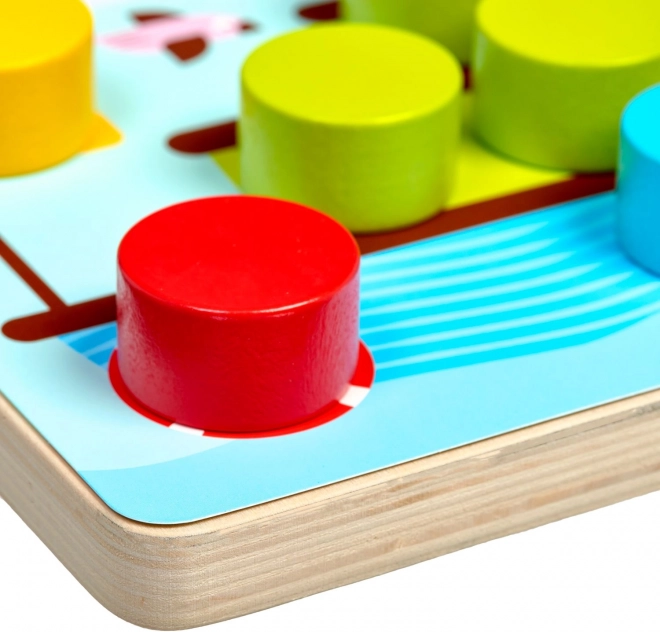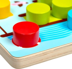 Velké dřevěné kolíky se snadno uchopují a vkládají do otvorů, což podporuje koordinaci oko–ruka a učení barev přirozenou hrou.