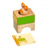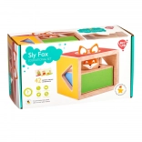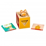 Tato dřevěná vzdělávací hra obsahuje tři masivní kostky s výřezy různých tvarů, dřevěnou figurku lišky a sadu oboustranných karet s úkoly různé obtížnosti. Děti podle předloh staví a kombinují kostky tak, aby se liška správně „schovala“, čímž trénují strategii a prostorové vnímání.