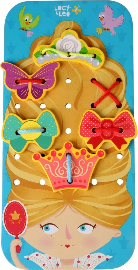 Objevte kreativní dřevěný šněrovací set Princezna od Lucy & Leo – zábavnou hračku pro rozvoj jemné motoriky, kreativity a logického myšlení. Děti dozdobí princezniny vlasy barevnými doplňky pomocí šněrování a trénují přitom koordinaci oko–ruka, poznávání barev a rozlišování tvarů. Skvělá volba jako Montessori pomůcka pro předškoláky.