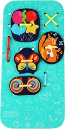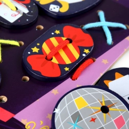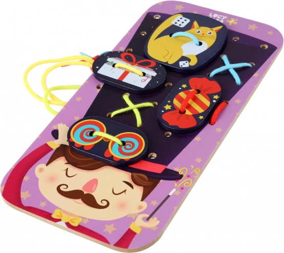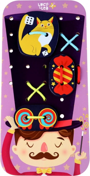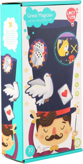 Tento zábavný šněrovací a provlékací set s motivem kouzelníka zve děti do světa fantazie. Na velkou podložku s hlavou kouzelníka a jeho kloboukem mohou pomocí tkaniček připevňovat barevné doplňky – od králíka a mincí až po tajemné karty. Při hraní si děti procvičují koordinaci oko–ruka, trpělivost a tvořivost.