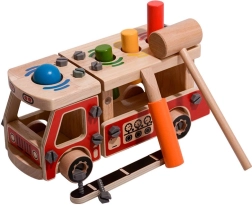 Tento kreativní set kombinuje stavebnici a zatloukačku v jednom. Děti si nejprve sestaví robustní hasičské auto ze dřeva a poté na jeho korbě využijí čtyři otvory k zábavnému zatloukání barevných prvků kladívkem. Díky jasným barvám a rozmanitým tvarům hračka podporuje přirozené učení a soustředění.