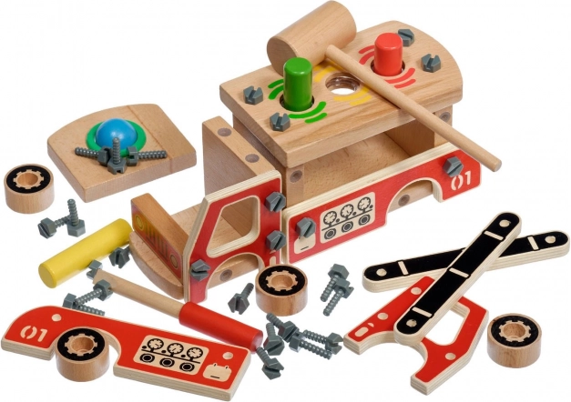 Sestavte funkční dřevěné hasičské auto se šrouby a nářadím. Proces stavby podporuje logické myšlení a trpělivost.
