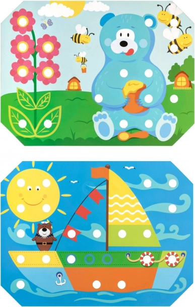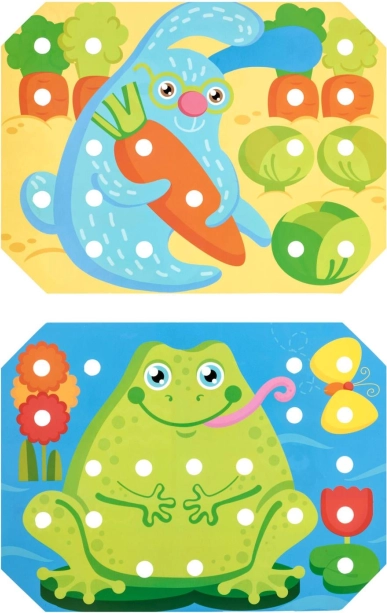 Děti si vyberou jednu z barevných předloh, položí ji na dřevěný podstavec a obrázek vyplňují kolíčky pomocí pinzety nebo rukou. Mohou také trénovat šněrování a vyšívání pomocí přiložených tkaniček. Hra přirozeně podporuje soustředění, logiku, trpělivost a přesnost.