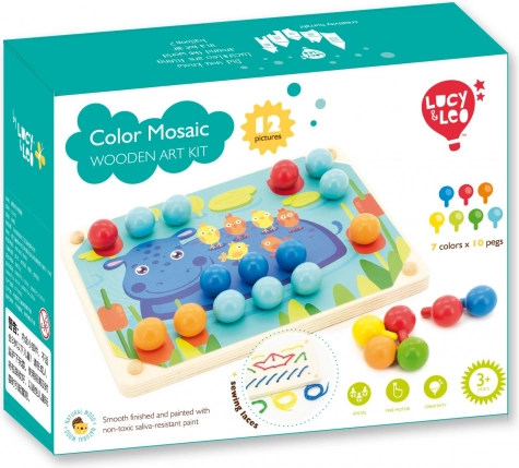 Set nabízí bohaté herní možnosti: skládání mozaiky podle předloh i vlastní fantazie, třídění podle barev, počítání kolíčků nebo procvičování úchopu. Po hraní se kolíčky jednoduše uloží do lněného pytlíku – vše je tak přehledné a připravené na další tvoření.