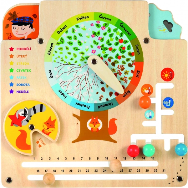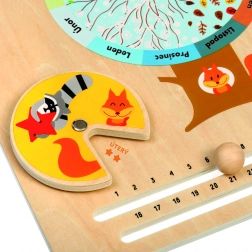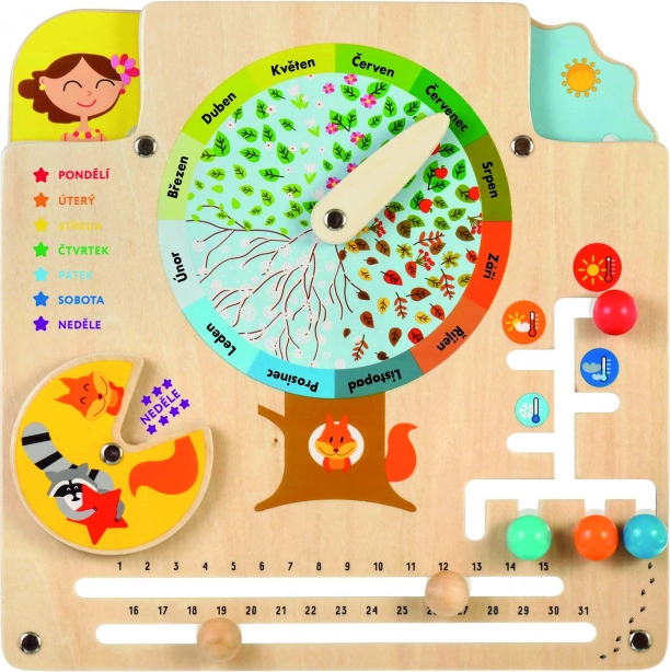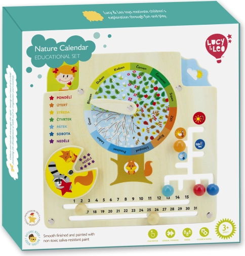 Dřevěný kalendář přírody LUCY & LEO je ideální pomůcka pro hravé učení. Uprostřed desky najdete listnatý ovocný strom s ukazatelem 12 měsíců, díky kterému si děti snadno spojí zimu se sněhem, jaro s květy, léto s ovocem a podzim s opadávajícími listy. Děti se zároveň učí poznávat dny v týdnu, počet dní v měsíci, počasí, teplotu a vhodné oblečení pro různé podmínky.