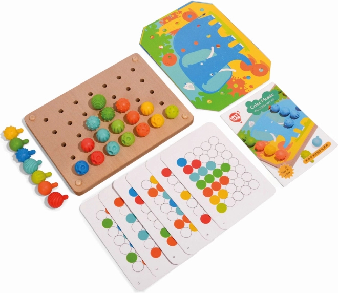 Mozaika a vyšívání je skvělým nástrojem pro malé děti k rozvoji jemných motorických dovedností a kreativity. Obsahuje 35 velkých silikonových kolíčků v sedmi vibrantních barvách, které děti mohou využít k vyplňování barevných předloh. Set rovněž obsahuje 12 barevných obrázků se zvířaty a 6 oboustranných šablon.