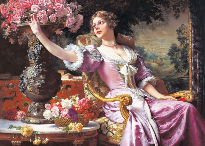 3 000 dílků představuje elegantní obraz ženy v nádherných fialových šatech, obklopené květinami.