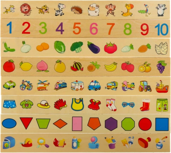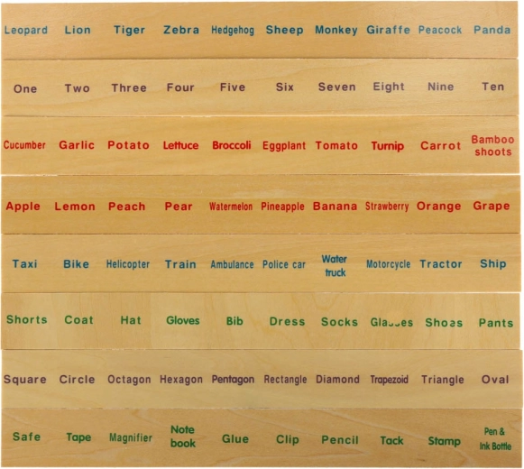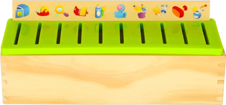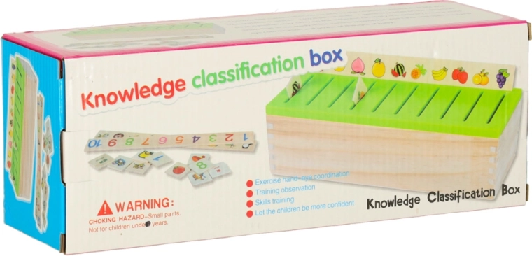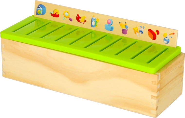 Vzdělávací sorter je promyšlená dřevěná skříňka s větraným zeleným víkem a sadou velkých tématických desek (čísla, tvary, zvířata, ovoce a zelenina, dopravní prostředky aj.). Děti přiřazují malé dřevěné kartičky s barevnými ilustracemi a anglickými pojmy k odpovídajícím obrázkům na desce a zasouvají je do správného slotu. Tím si cvičí pozorování, paměť, koncentraci a budují slovní zásobu.
