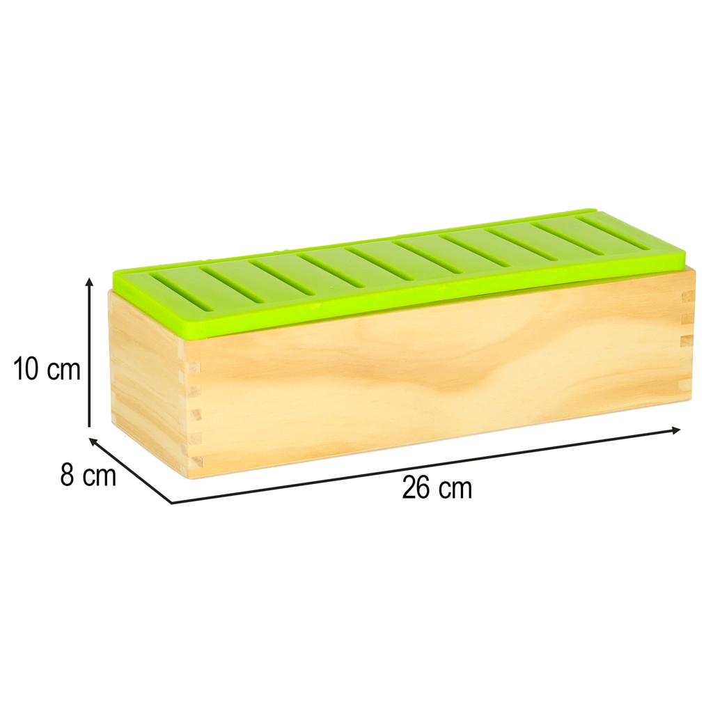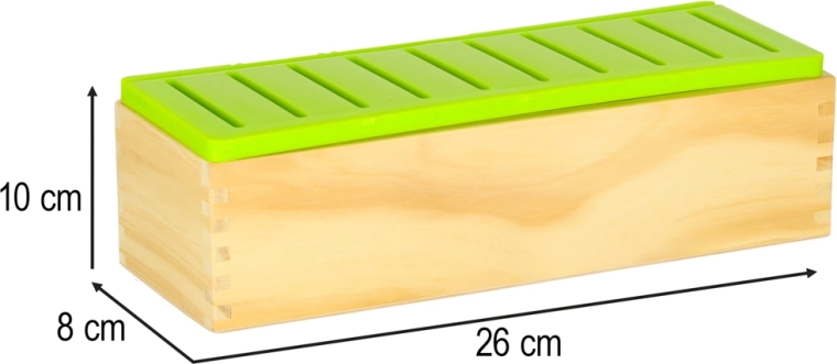 Pevné dřevo, hladce zabroušené hrany a odnímatelné plastové víko se sloty pro snadné vkládání i čištění. Ideální pro každodenní hraní.