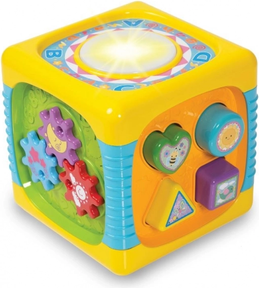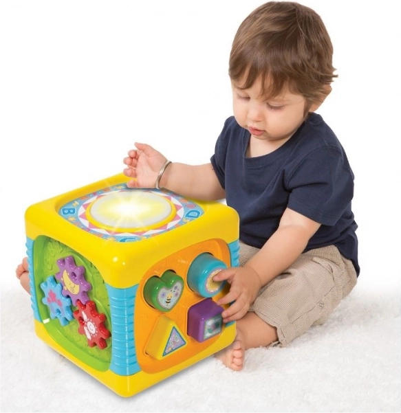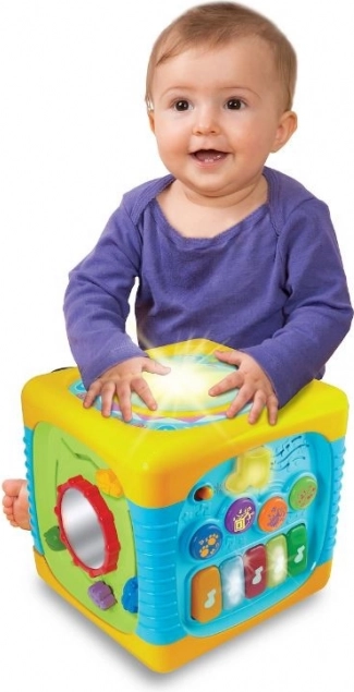Tato interaktivní kostka je navržena tak, aby děti bavila a současně rozvíjela jejich dovednosti. Jasné barvy, blikající světýlka a příjemné melodie povzbuzují zrak a sluch, zatímco tlačítka, převody a posuvné prvky rozvíjejí hmat a jemnou motoriku.