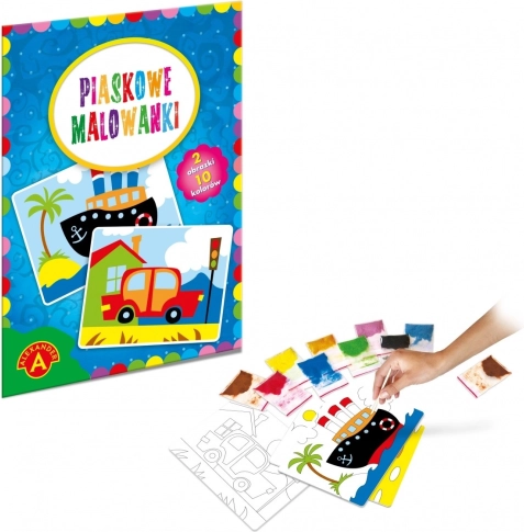 Sada obsahuje vše potřebné: 2 předlohy k vybarvení, 10 sáčků barevného písku, dřevěnou špachtli pro snadné odkrývání a podrobný návod. Tvoření je intuitivní, podporuje současné učení barev a rozvoj koordinace oko–ruka.