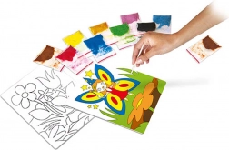 - 2 obrázky k vybarvení, patříčko, 11 sáčků s barevným pískem, návod