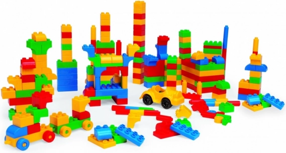 Různé barevné bloky pro stavění věží, aut a dalších tvarů.