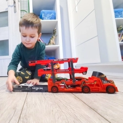 Tento odolný přepravník aut kombinuje atraktivní design s chytrými funkcemi pro hodiny kreativní zábavy. Třípatrová platforma pohodlně pojme všech šest autíček, zadní sklopná rampa usnadní nájezd a přední výjezd přidá do hry další možnosti. Díky kovovým die-cast autíčkům a detailnímu zpracování působí hra realisticky a děti rozvíjejí fantazii i jemnou motoriku.