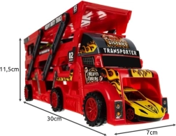 Transportér je vyroben z kvalitního plastu, autíčka z kombinace kovu a plastu. Intuitivní manuální vystřelovač umožní bleskové starty bez baterií. Kompaktní rozměry kamionu (30 × 12 × 7 cm) a autíček (7 × 2 × 3 cm) z něj dělají ideální hračku do pokojíčku i na cesty.