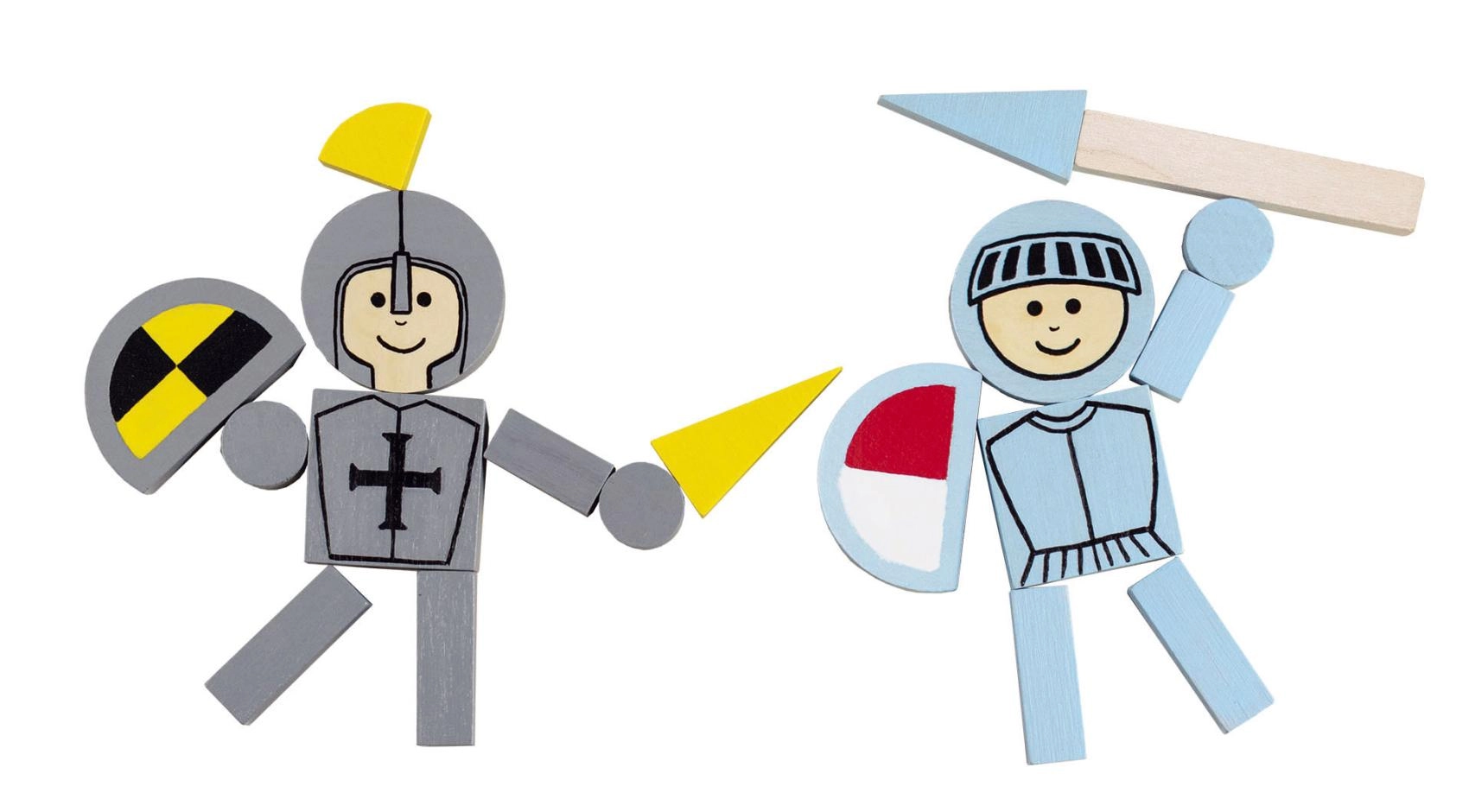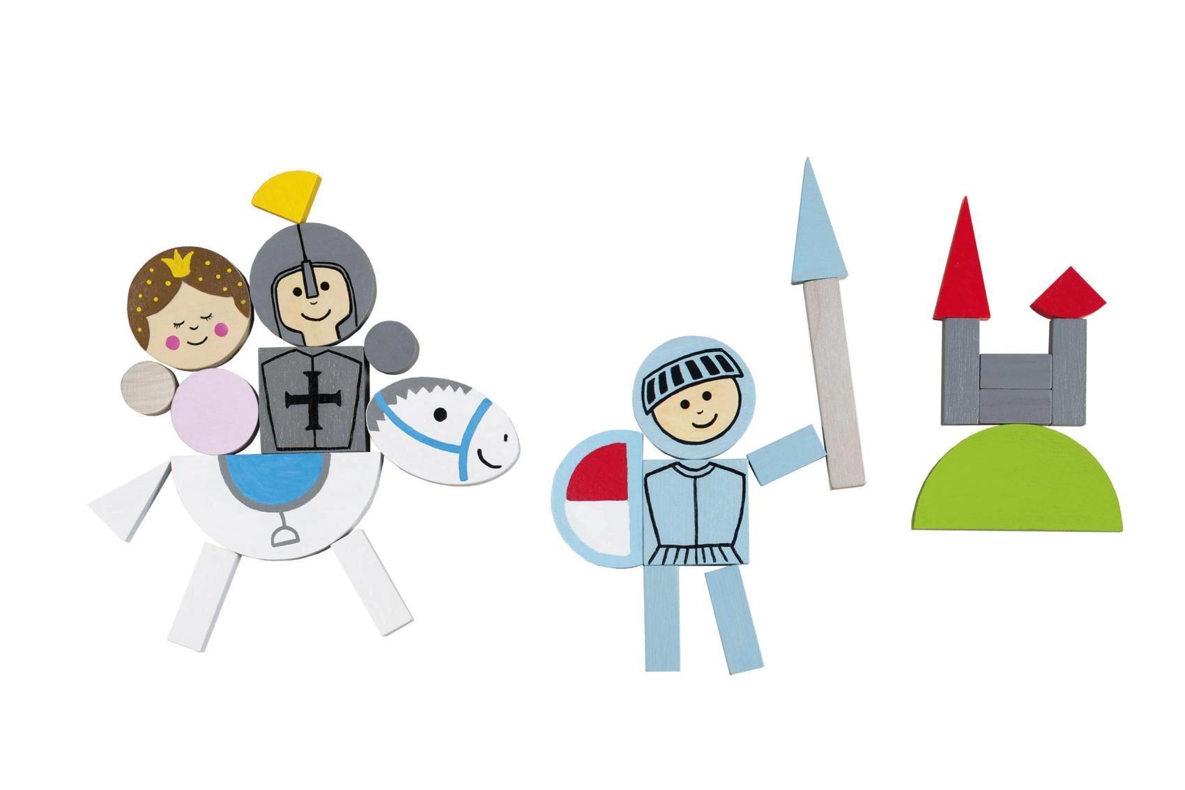 Barevné dřevěné prvky s hladkým povrchem umožní dětem skládat rytíře, štíty, kopí i končetiny – ideální pro rozvoj motoriky a představivosti.