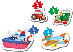 Objevte zábavný svět skládání pro nejmenší. Tento set obsahuje čtyři samostatná puzzle s motivy různých dopravních prostředků a stupňovanou náročností (2, 3, 4 a 5 dílků), aby si děti mohly postupně budovat jistotu i dovednosti.