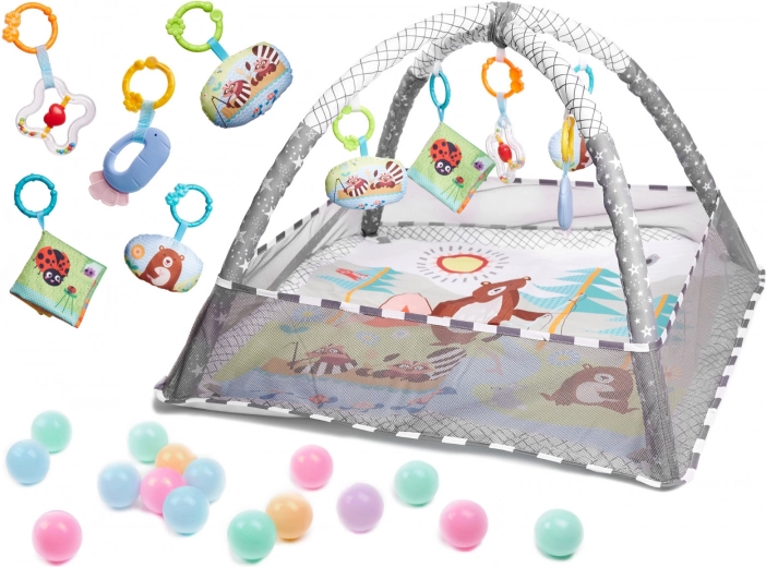 Jedna podložka - mnoho možností! Podložka s ohrádkou - dítě ležící na zádech nebo na bříšku může pozorovat okolní prostor. Ohrádka vytváří pocit bezpečí pro dítě i rodiče. Podložka s hračkami zavěšenými na obloucích - barevné hračky zavěšené na obloucích přitahují pozornost dítěte a motivují ho ke cvičení a posilování svalů krku, rukou a nohou. Navíc bude ideální pro první pokusy o samostatné sezení. Suchý bazén - naplněním ohrádky míčky získáte podložku bez oblouků - po odstranění oblouků síť tvořící ohrádku spadne dolů, pak bude podložka dokonalou izolací od chladné země, vymezí hrací zónu a úspěšně nahradí koberec v dětském pokoji. Barevná chrastítka a knížka s přiloženými šustícími stránkami upoutají pozornost batolete a budou stimulovat zrak, sluch a hmat. Navíc budou dokonalým úvodem do světa tvarů a barev. Moderní design a důraz na detail rodiče nadchne.