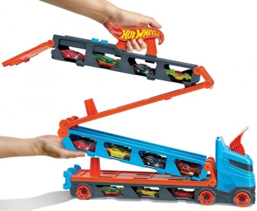 Hot Wheels závodní transporter 2v1 s tratí 1,8 m a úložným místem pro 20 autíček