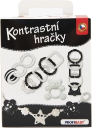 Kontrastní sada hraček pro miminka – chrastítka, kousátko a závěsná zábrana na kočárek