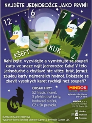Objevte svižnou a zábavnou karetní hru Kabo, ve které se snažíte jako první najít bájného jednorožce a zbavit se vysokých karet. Hráči mezi sebou nakukují do karet, vyzvídají informace a chytře mění karty, aby jim na konci zůstaly nejnižší hodnoty. Ideální rodinná hra od 8 let s jednoduchými pravidly a chytlavou herní dynamikou.