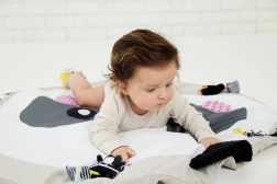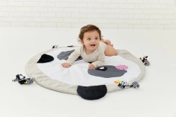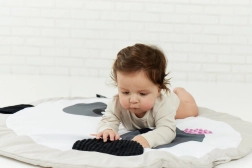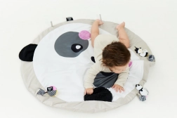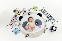 Objevte měkkou a bezpečnou smyslovou podložku pro miminka s motivem pandy od GAGAGU. Kontrastní černo-bílé vzory podporují zrakový vývoj, různé textury na uších a tvářičkách rozvíjejí hmat a všitý šustivý materiál stimuluje sluch. Podložka je bez plastových dílů, příjemně měkká a hustá pro tepelný komfort, s praktickými smyčkami pro připevnění dalších hraček.