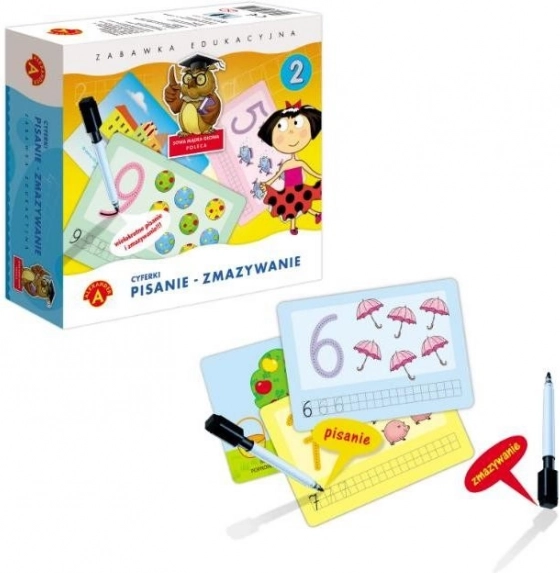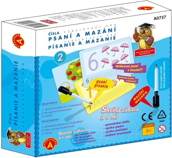 Zábavná vzdělávací hra pro předškoláky, která dětem pomůže osvojit si správné tvary číslic, jejich poznávání a základy počítání. Díky tabulkám na opakované použití s mazacím fixem trénují děti také jemnou motoriku, postřeh a součení – vše hravou formou.