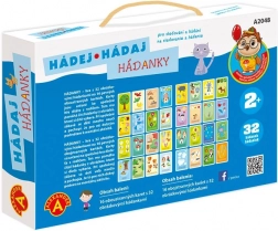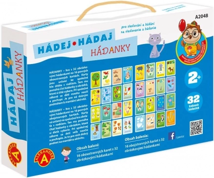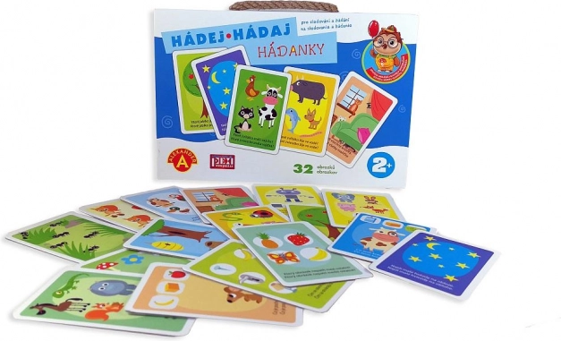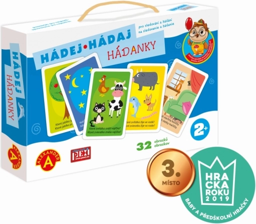Objevujte svět s dětmi formou hry. Alexander Hádej hádej hádanky je naučná a poznávací hra pro děti od 24 měsíců, která je motivuje k přemýšlení, rozvíjí jejich slovní zásobu a učí je nové pojmy. Díky obrázkovým hádankám a jednoduchým kvízům děti trénují základní dovednosti a upevňují si dosavadní znalosti.