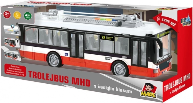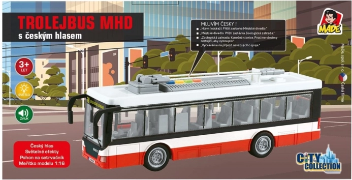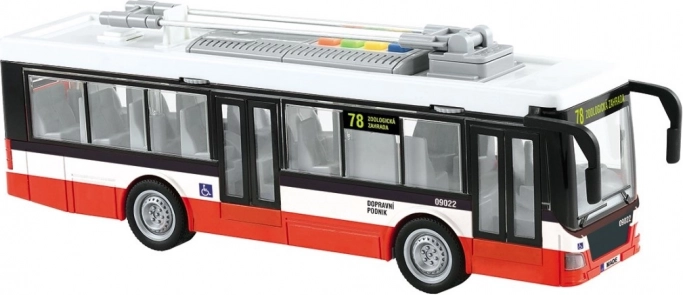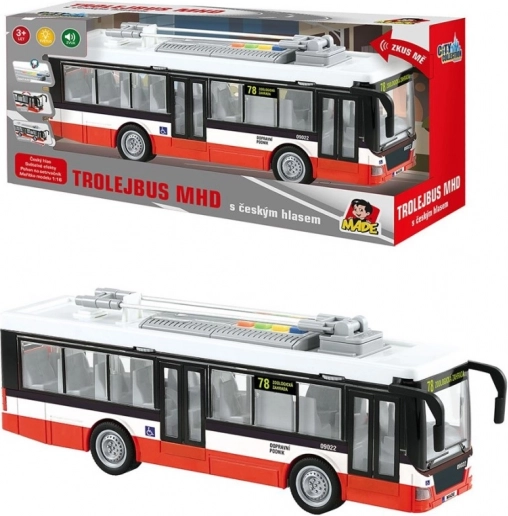 Tento detailně zpracovaný trolejbus přináší dětem autentický zážitek z městské dopravy. Hračka přehrává hlášení zastávek v češtině (Hlavní nádraží, Městské divadlo, Zoologická zahrada) a je doplněna o atraktivní světelné efekty. Díky pohonu na setrvačník stačí trolejbus postrčit a rozjede se vpřed.