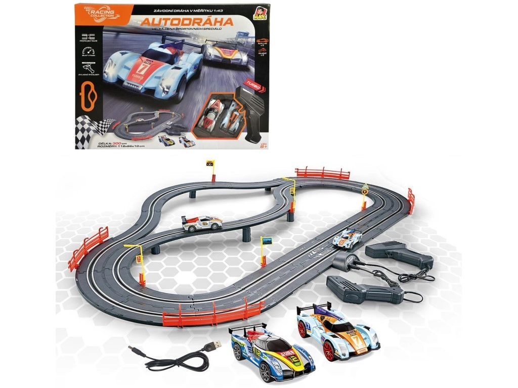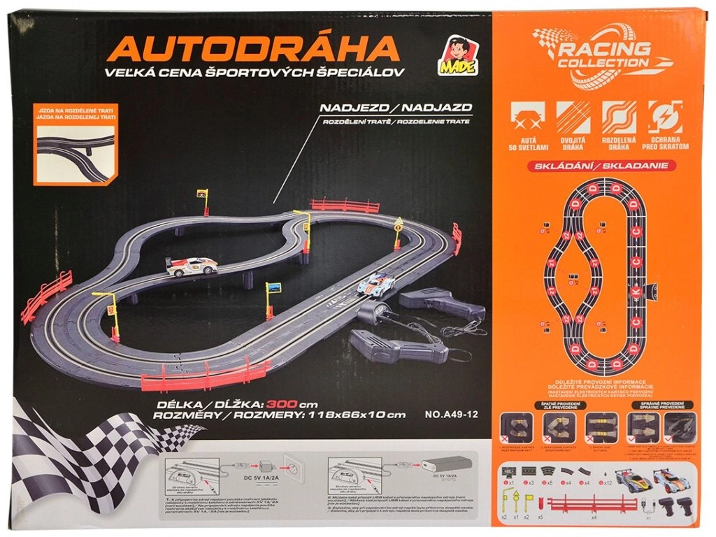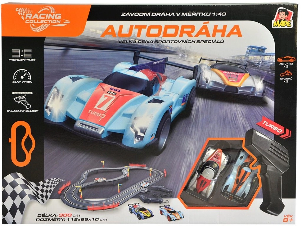 Součástí balení jsou dvě závodní auta a dva ruční ovladače pro okamžité starty a precizní kontrolu rychlosti. Autodráha je balena v českém boxu a je ideální jako dárek pro malé i velké nadšence do závodění.